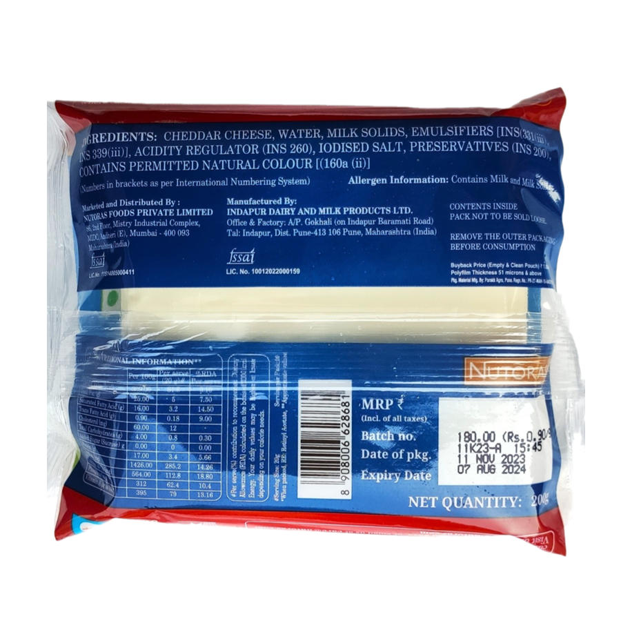 Nutoras Cheddar Processed Cheese Slice is a pack of ten Individually wrapped slices made of cheddar cheese that is packaged for convenience. Cheddar cheese is a popular type of cheese that originated in the English village of Cheddar in the 12th century. It is known for its rich, nutty flavor and smooth texture.